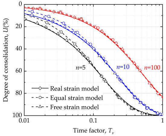 (2) We acquired variations in the average degree of consolidation over time for all three models. The free strain model provided the most similar degree of consolidation to the real strain model, unlike the equal strain model, which recorded a lower initial degree of consolidation when the drain spacing ratio was small.