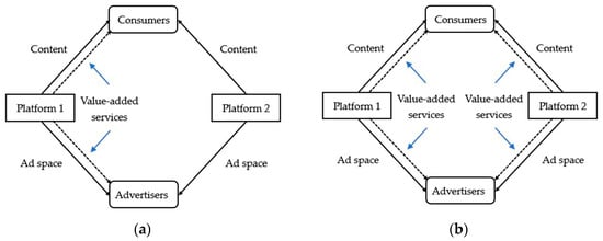 With the development of mobile internet and informatization, various media platforms, e.g., video platforms, are booming [1,2,3,4]. Media platforms provide content for consumers and ad space for advertisers and profit mostly from charging advertisers [5]. To engage more consumers and advertisers, media platforms have introduced a category of value-added services that can directly enhance the experience of both consumers and advertisers, referred to as two-sided beneficial value-added services. For example, video platforms such as “Iqiyi” and “Youku” allow advertisers to embed links in ads, and if consumers are interested in the products in the ads, they can quickly find the purchase pages by clicking on the links. This value-added service can not only satisfy consumers’ demand for shopping while watching videos but also help advertisers quickly obtain marketing benefits. It is clear that such value-added service investment can increase the utility that can be obtained from the platform by viewers and advertisers. However, more investment in value-added services is not always better for two major reasons. First, in some cases, a platform’s overinvestment in value-added services may be detrimental to its ability to attract consumers and advertisers. This is easy to understand. On the one hand, the high-level value-added services provided by the investment platform can directly bring consumers more utility, which improves the consumer demand for the platform. On the other hand, the high-level value-added services also can directly bring advertisers more utility, which improves the advertiser demand for the platform; however, this will reduce the consumer demand for the platform with the impact of negative cross-network effects from advertisers to consumers (i.e., negative advertising effects) [6]. Clearly, the high-level value-added services have two opposite influences on the consumer demand for the investment platform. If the latter influence is dominant, the consumer demand for the platform may decrease. Furthermore, the advertiser demand for the platform also decreases due to positive cross-network effects from consumers to advertisers (i.e., positive consumer effects) [6]. Briefly, in some conditions, with the impact of positive consumer effects and negative advertising effects, overinvestment instead suppresses consumer and advertiser demands for the platform. Second, overinvestment will cause the platform to generate more investment costs. For the above two reasons, we know that only by formulating an appropriate value-added service investment strategy can the platform effectively attract consumers and advertisers and avoid excessive costs. Note that platform pricing, as well as value-added service investments, is also closely related to the utilities and demands of consumers and advertisers. When the consumer demand or advertiser demand for a platform changes due to value-added service investments, the platform should adjust its price accordingly to maximize profits. In summary, only appropriate two-sided beneficial value-added service investment and pricing strategies can help media platforms to effectively carry out the services, avoid more costs and achieve more profits. This will promote the sustainable development of media platforms.