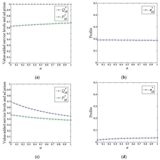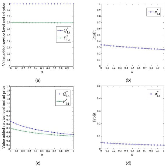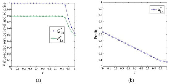 When , platform 1 investing in value-added services that can directly benefit consumers and advertisers faces low costs, and therefore, it is optimal for the platform to maintain maximum investment in value-added services, that is, . With constant investment, consumers can derive an invariant utility, and thus their demand for the platform remains constant, which implies that the cross-network utility that advertisers receive from consumers remains the same. In addition to cross-network utility, advertisers can also receive a constant benefit directly from the value-added service investment. Due to the same cross-network utility and benefit, advertiser utility and demand for platform 1 remain constant, and naturally, platform 1 does not need to change its ad price. Clearly, the ad revenue of the platform remains unchanged. However, the total investment cost of platform 1 increases with the marginal investment cost, and thus, the profit of the platform decreases with the marginal investment cost.