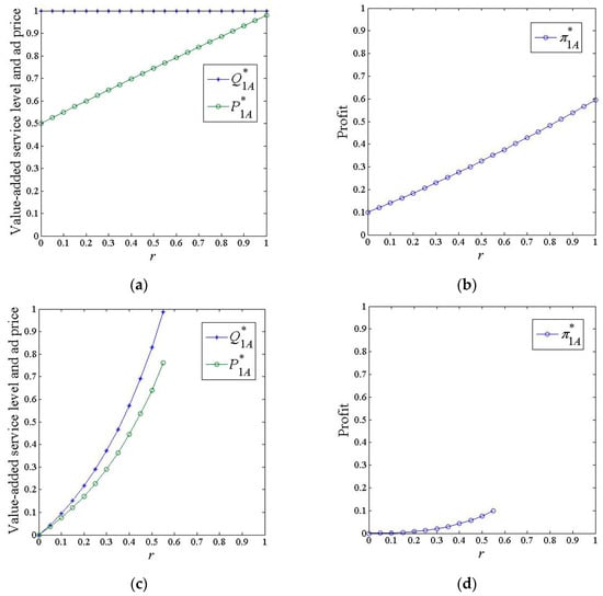 From Corollary 4, we can also see that if , the profit of platform varies in three stages with the marginal investment cost; that is, as the marginal investment cost increases, the profit first decreases, then increases, and finally decreases. If , the profit of platform always decreases with the marginal investment cost.