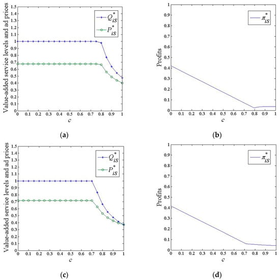 We observe from Corollary 4 that in conditions of and , the value-added service level and ad price of platform , , remain constant and then decrease with the marginal investment cost.