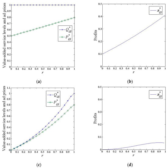 Solving Equation (11) yields the equilibrium value-added service levels, and , and ad prices, and . Furthermore, substituting , , and into Equations (9)–(11) yields the equilibrium advertiser demands, and , consumer demands, and , and profits and . The above equilibrium outcomes are shown in Proposition 2.