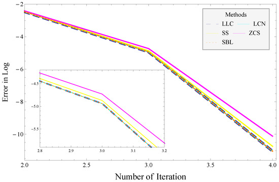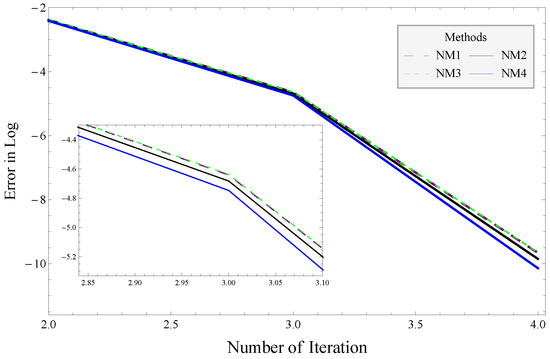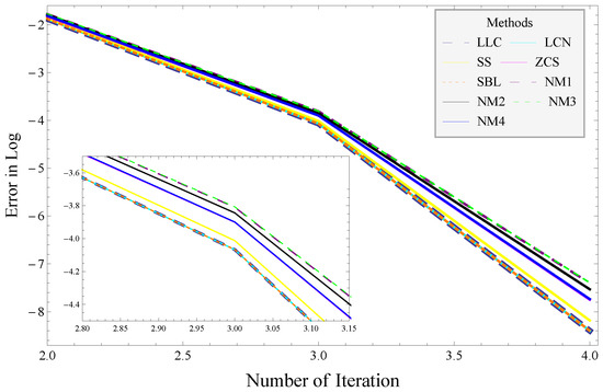 that has three roots . So, our desired root is with . The methods are tested for two initial guesses . Computed results are given in Table 6. Figure 1 and Figure 2 represent the graph of the errors committed by methods as iteration proceeds for at and , respectively. However, some graphs overlap each other. So, to make it more clear, we further draw the graphs in Figure 3 and Figure 4 for the following methods: LLC, LCN, SS, ZCS, SBL, and Figure 5 and Figure 6 for the methods: NM1, NM2, NM3 and NM4. To make the pictures more clear, the bending portion of the lines is shown in sub-figures within the Figure 1, Figure 2, Figure 3, Figure 4, Figure 5 and Figure 6. It can be observed from the graphs that newly proposed methods are good competitors to existing Newton-like methods. Figure 1, Figure 2, Figure 3, Figure 4, Figure 5 and Figure 6 are drawn using the Mathematica software. These figures are the geometrical representation of the errors shown in columns 3, 4, and 5 of Table 6 that help us visualize methods’ behavior for different initial guesses.