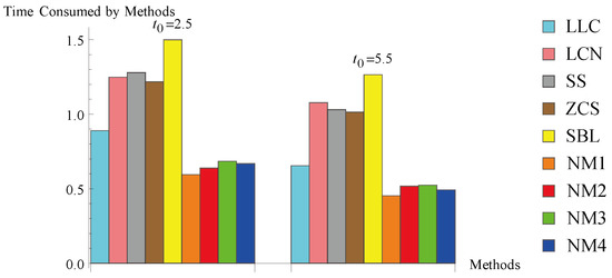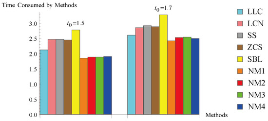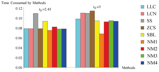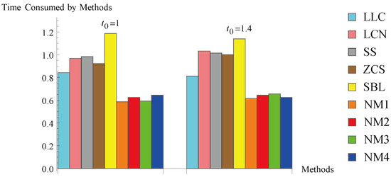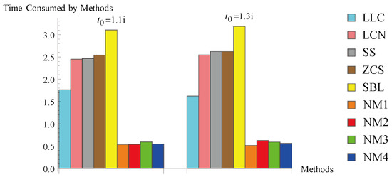 We can see from the computed results in Table 6 and Table 2, Table 3, Table 4 and Table 5 that the new methods have good convergence behavior. The increment in precision per iteration, as seen by the numerical results, is the reason for good convergence. This also describes the stable nature of the methods. It is also clear from the computed results that the new methods have better authenticity than those calculated by the existing methods. We display the value in Table 3 at the stage when the stopping criterion has been satisfied. The calculation of the convergence order in each problem, as shown in the tables, implies verification of the theoretical convergence order four. Efficiency of the new methods can also be judged by the fact that the amount of CPU time required by the methods is less than that required by the existing ones. This is shown in Figure 7, Figure 8, Figure 9, Figure 10 and Figure 11 where we draw a bar chart of the time consumed by the methods.