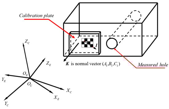 The direction vector of OEZE in local coordinates can be obtained by the surface expression of the hole group, and the direction vector is (A1, B1, C1). As shown in Figure 1, to obtain the expression of the surface of the hole group, this paper attaches the lower surface of the checkerboard calibration plate to the surface of the measured hole to ensure that the surface of the calibration plate is parallel to the surface of the hole. According to the two-step calibration method, the camera coordinates of each corner on the calibration plate can be obtained, the coordinates of the corners are substituted into Equation (1), and the direction vector of the calibration plate can be solved by least squares fitting. Since the surface of the calibration plate is parallel to the surface of the measured hole, the direction vector of the calibration plate is the direction vector of OEZE. According to the direction vector of OEZE, the direction cosine of the local coordinate axis in the camera coordinate system can be obtained: