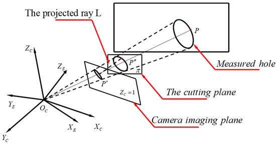 Through Equation (16) and the equation of the cutting plane π, the coordinates of the projection point, which is the edge point of the measured hole on the image plane, could be obtained, and the coordinates of the projection point are set as (xi, yi, zi).