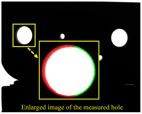 Second, it is difficult to ensure that the surface of the hole is parallel to the imaging plane of the camera. The edges of the holes on two different surfaces are captured in the image simultaneously. It leads to only the edge points of a part of the hole participating in the calculation as fitting points, and these points can’t represent the complete measured hole information. As shown in Figure 3, the edge of a hole in the mold is detected by the edge detection algorithm. The green point is the edge point of the front surface of the tested hole, which is the data point that can be used for fitting. The red point contains the edge points of the front and rear hole surfaces, and the two types of points are difficult to distinguish through the algorithm, and the edge points on the rear surface of the measured hole cannot participate in the circle fitting calculation. Therefore, the points participating in the fitting can only express part of the geometric information of the measured hole, resulting in the fitting error.