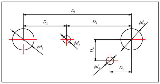 To verify the accuracy of the hole center distance and the hole diameter measurement model proposed in this paper, the distance between the center of each hole and the hole diameter was obtained by a three-coordinate measuring instrument. The coordinate measuring machine used in this paper is made by ZEISS company, and the model is Spectrum ll 7/10/6. The measurement accuracy of the device is 2 μm. The measurement results are shown in Table 4, and the dimensions codes in this table are shown in Figure 8.