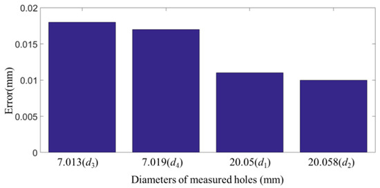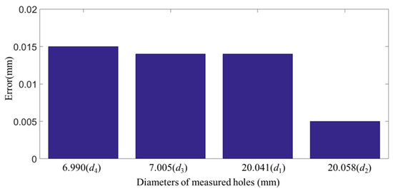 According to the measurement comparison results, the average error of the diameter measurement is 0.013 mm, the maximum error is less than 0.018 mm, and the variance of the aperture measurement error is 1.77 × 10−5. To further analyze the experimental results, the relationship between the hole diameter and the corresponding measurement error is plotted, as shown in Figure 10 and Figure 11. The aperture measurement error corresponding to smaller diameter holes is higher than the measurement error corresponding to larger diameter holes. The reason for this trend is that a smaller diameter hole contains fewer data points. The error in the data points has a greater impact on the accuracy of the aperture measurement.