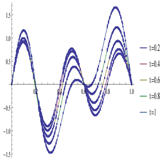 In addition, the graphs of the exact and approximate solutions for t = 0.2, 0.4, 0.6, 0.8, 1 are given in Figure 1. The dot points are the approximate solutions, and the solid lines are the exact solutions.