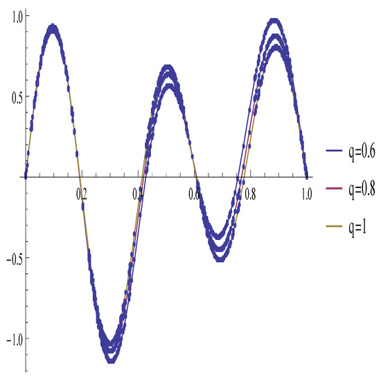 We also show the graph of exact and approximate solutions at for different values of q in Figure 3.