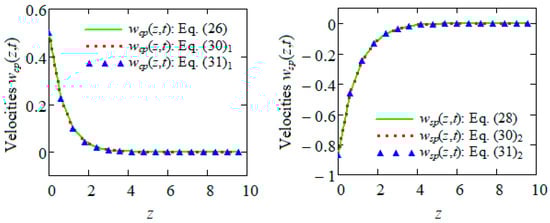 The equivalence of the expressions of the velocities and given by Equations (26), (30)1, (31)1 and (28), (30)2, (31)2, respectively, for and .