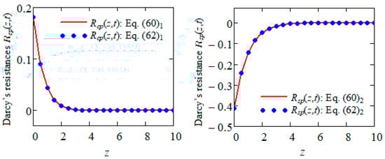 The equivalence of the expressions of Darcy’s resistances and given by the relations (60)1, (62)1 and (60)2, (62)2, respectively, is proved by Figure 3.