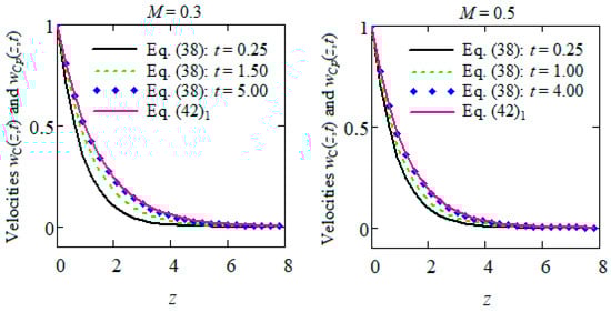 Convergence of starting velocity given by Equation (38) to its steady component given by Equation (42)1 for two values of M and increasing values of the time t.