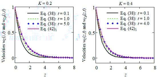 Convergence of starting velocity given by Equation (38) to its steady component given by Equation (42)1 for two values of K and increasing values of the time t.