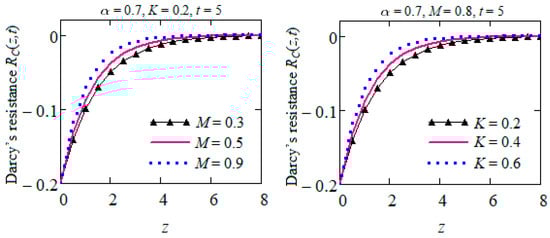 In order to show the flow resistance of the fluid, the variations of the Darcy’s resistance against z given by Equation (40) are presented in Figure 6 for and increasing values of the magnetic parameter M and and increasing values of the porosity parameter K. From these figures, the result is clearly that the flow resistance of fluid, in absolute value, declines for increasing values of M and is an increasing function with respect to the parameter K. Consequently, the fluid flows faster in the presence of a magnetic field while its velocity, as expected, diminishes through porous media.
