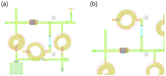 Circuit layout corresponding to before and after “pruning” operation. The 1–3 numbers marked in the image indicate the node ID corresponding to the traceable device. (a) The circuit layout after normal concatenation. (b) The circuit layout after the “pruning” operation.