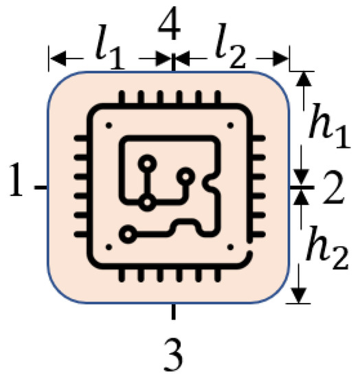 In the PCell structure involved in this article, there are at most four pins for each PCell on the RFIC device, and the shape of the RFIC device can be approximated by a rectangle. This means that the PCell structure of the device can be described by a rectangle and four boundary center points. Taking a four-port device as an example, its structure diagram is shown in Figure 7. For a device with the coordinates of pin No. 1 being , the device structure is described by size vector X, and the calculation formula for size vector X is