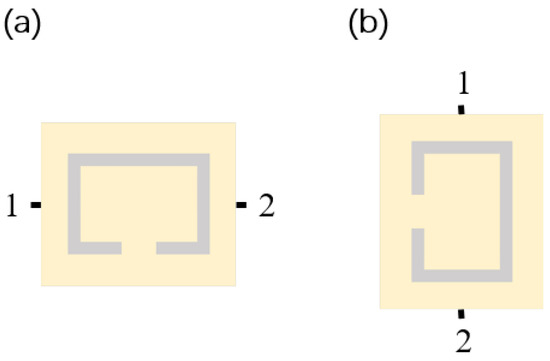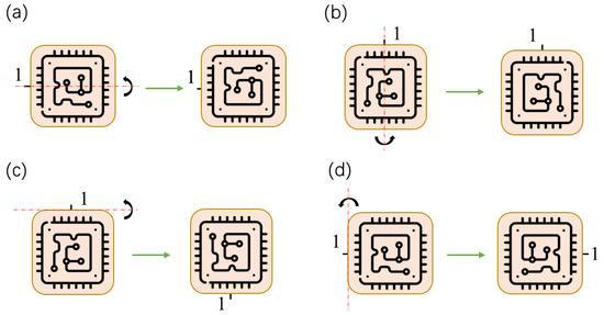 As shown in Figure 10a,c, let be the coordinates of port 1 of a device, and be the coordinate of port i. When the device undergoes an up–down mirror operation (flipped upwards and downwards with port 1 as the reference point), the calculation formula for coordinates of port i is