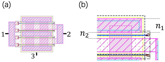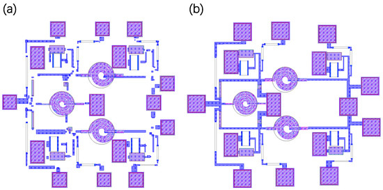 The algorithm started by setting the device PCell parameters based on the extracted device parameters and placing the PCell devices according to their relative positions in the photo to obtain an initial layout, as shown in Figure 30a. However, the initial layout had overlaps between PCell devices and broken port splicing. To address these issues, the proposed algorithm was used to polish the layout, resulting in a final layout as shown in Figure 30b. This layout generation took 124 ms, and the generated layout area was 913 × 898 m2.