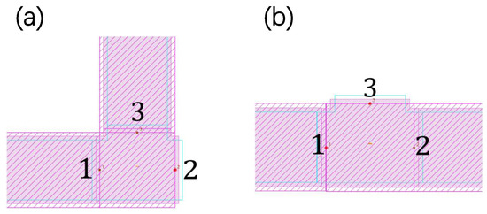 As illustrated in Figure 6, Device 2 belongs to the retrievable device type and also composes the corner of the loop. During the layout concatenation process, when Device 2 is normally concatenated (as shown in Figure 6a), an intersection occurs, and the loop structure fails to close properly. According to the topological characteristics of the RF circuit, whether Device 2 should be mirrored can be predetermined. Therefore, for the decision regarding Node 2, the correct path can be directly selected, resulting in the final successful concatenation illustrated in Figure 6b. This operation realizes “pruning” and reduces the pathfinding time of the binary tree.
