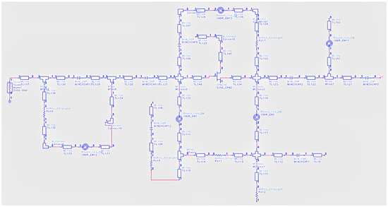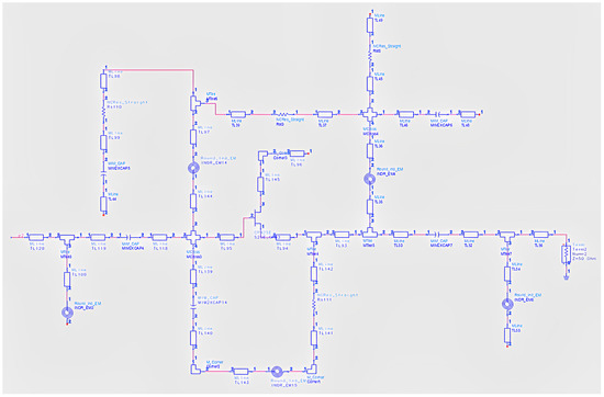 ADS software provides built-in tools for generating circuit layouts. To compare the results of these tools with the algorithm proposed in this paper, the same circuit topology was used to generate layouts using the built-in tools in ADS, as shown in Figure 28. The layout generated by ADS appears chaotic, with many intersections. Based on the verification conducted in this study, the algorithm proposed in this paper demonstrates a superior splicing effect when compared with the layout mosaic tool provided in ADS.