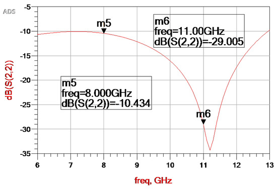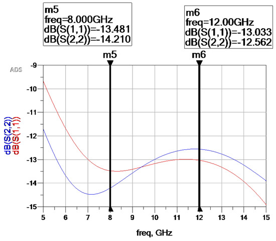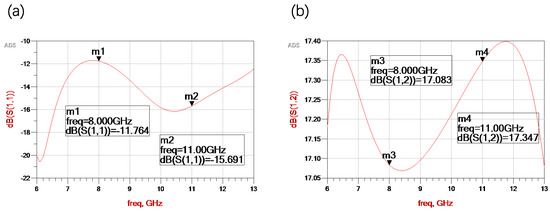 The simulation results of the circuit schematic are illustrated in Figure 23 and Figure 24. This circuit is a low-noise amplifier operating in the frequency range of 6–13 GHz. As can be observed from the figures, both S11 and S22 of the simulation results are less than 10 dB within the operating frequency band. The simulation result of S12 is around 17 dB, demonstrating the high potential of this design chip.