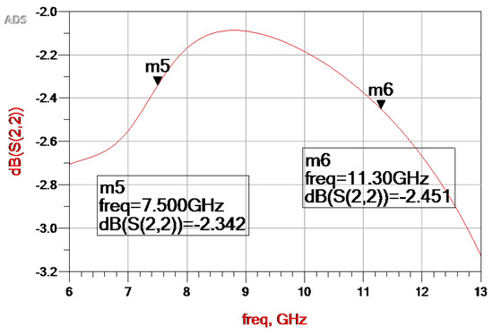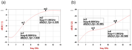The generated layout underwent simulation testing. As shown in Figure 31, the circuit exhibited return loss (S11 and S22) that was superior to −20 dB within the 8–12 GHz frequency range, indicating minimal reflected energy and optimal impedance matching within the design. Moreover, Figure 32a depicts the switch’s isolation (S31) to be less than −20 dB within the bandwidth, reflecting an excellent separation of signals between the input and the two output ports. Additionally, Figure 32b indicates that the insertion loss (S21) was greater than −1.5 dB, denoting efficient transmission of input signals to output ports. In light of these observations, the switch layout is regarded as performing well and possessing considerable potential for eventual adoption in practical applications.