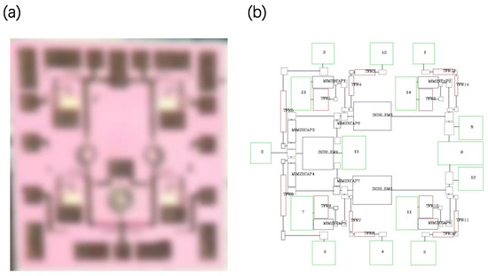 Figure 29a displays a blurred photomicrograph of the chip under a microscope to safeguard the circuit IP. The information extraction algorithm was then utilized to extract physical information such as device parameters, circuit topology, and device port coordinates from the digital photo. The resulting circuit topology is shown in Figure 29b. The chapter focuses on the PDK technology provided by Lion and demonstrates how the algorithm can be utilized for achieving process migration and layout reproduction for the circuit.