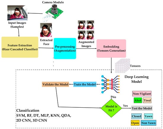 This introduces a method for detecting drowsiness, due to fatigue, among drivers by monitoring their conduct, specifically utilizing videos and images. The system is composed of four principal phases, including feature extraction, preprocessing, scaling, and classification. In the feature extraction phase, the Haar Cascaded Classifier is utilized to extract the driver’s facial and ocular features from the captured videos or images. Furthermore, the preprocessed facial images are enhanced by utilizing data augmentation techniques to increase the amount of input data for the classification procedure. Moreover, the enhanced data is standardized and scaled to be incorporated into the classification models. The overall architecture of the suggested system is depicted in Figure 2. The concept of the proposed system is to detect fatigue (tiredness), which is a primary cause of drowsiness. The algorithm of the proposed system is shown in Algorithm 1. First, the input video, which is recorded at a rate of 30 frames per second, is fed into the system. Then, the face is extracted from the video frame in the “Face extraction” step. The extracted faces are enrolled in to “Face detection” step for face and eye recognition. The classification process to detect drowsiness from facial symptoms and yawning is performed in Step 3, while the detection of drowsiness from the detected eyes is performed in Steps 4 and 5. We deployed HCC to detect them to be fed into the classifiers to detect their state, whether open or not. The steps of the proposed algorithm are as follows: