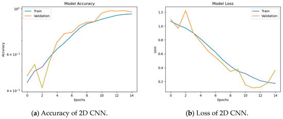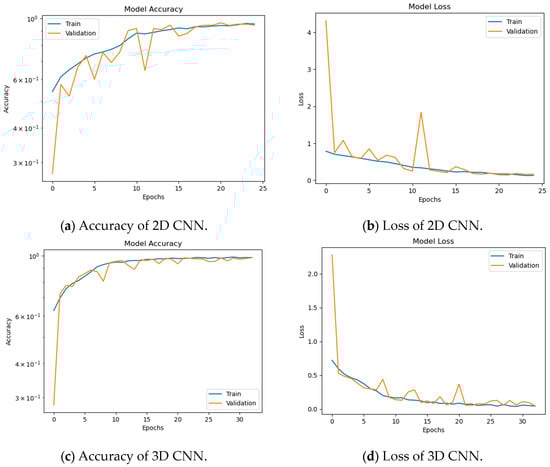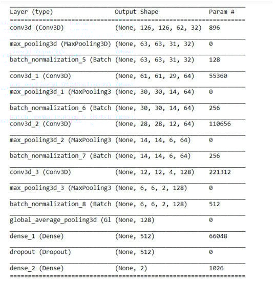 Another objective is the fully connected task, which is managed by utilizing a 3D global average pooling (3D GAP) to process the output 3D feature map generated by the convolutional and pooling layers sequence. The GAP layer is subsequently followed by a series of dense layers that produce an eigenvector, which is then fed into the classification layer. This classification layer consists of a dense layer equipped with a softmax activation function. The architecture of the proposed 2D and 3D model is shown in Figure 4 and Figure 5.