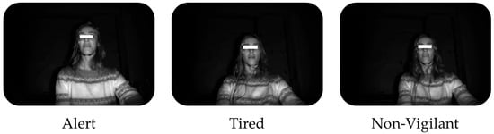 The proposed techniques are executed on the “ULg Multimodality Drowsiness Database,” commonly abbreviated as DROZY [46]. This database comprises two segments. The first segment entails collecting data from 14 young, healthy individuals, comprising three males and eleven females, utilizing video streaming monitoring. The data in this segment was gathered utilizing Kinect technology and video sensors that are equipped with Near-Infrared (NIR) sensitivity, resulting in a resolution of 512 × 424 pixels in MP4 format. Illustrations of NIR intensity scenes generated from video frames are displayed in Figure 6. This dataset is collected at the rate of frames of 30 frames per second (time interval of 33.33 ms) with a number of frames of 17,000 frames per person. Table 1 illustrates the number of images for each person involved in this dataset (publicly provided).