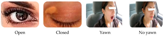 The second dataset is the drowsiness dataset [24]. This dataset comprises images of the drivers with different eye and face symptoms, including eyes closed or open and yawning or not. The objective is to distinguish among these states using the proposed deep learning models. In addition, data augmentation is employed to increase the number of images fed into the deep-learning models. Figure 7 shows samples of this dataset.