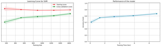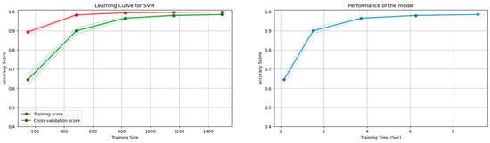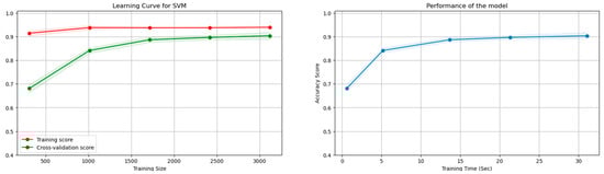 To provide a general and robust scenario, we combined the image and video datasets and fed them into the proposed models. This scenario provides seven classification categories, including the driver’s status and face symptoms. These categories can be summarized as follows: alert, non-vigilant, tired, eye open, eye closed, yawn, and no yawn. The proposed machine and deep learning models are carried out on the combined dataset to be evaluated. Figure 13 and Figure 14 show the learning curves of the proposed machine learning and deep learning models, respectively. Furthermore, the simulation results of the proposed models are illustrated in Table 6. The simulation results reveal that the proposed RF model outperforms the machine learning models, while 3D CNNs do in the deep learning models. The superior models achieved 90% and 98% accuracy for RF and 3D CNNs, respectively. Therefore. They can be considered efficient solutions for robust conditions.
