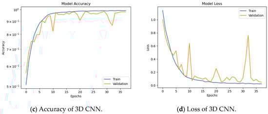 Additionally, the deep learning methodology consists of two deep learning models. The first model, namely the 3D CNN, comprises 16 layers. Its structure encompasses several duties, including feature extraction, feature reduction, full connectivity, and classification. The feature extraction stage employs four 3D convolutional layers with filter sizes 32, 64, 64, and 128. Furthermore, the feature reduction task is accomplished through four 3D Max pooling layers, using a window size of 2. Both these tasks operate on the 3D modality to handle the depth of the input images, where the input video frames are fed into the proposed model with an input shape of (162, 162, and 3). Consequently, this model intends to account for any color changes that may occur within the frame’s color channels.