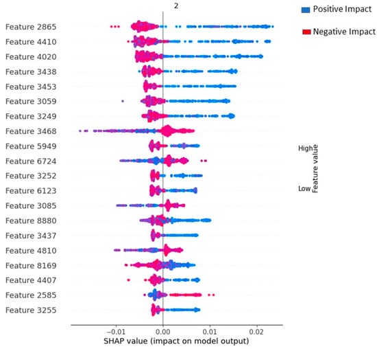 In this section, SHAP summary plots were employed to exhibit the ranking of the features. The SHAP summary plot, as demonstrated in Figure 15, displays the features as lines, with the dot denoting the impact of these features in a specific instance. The colors on the plot denote feature correlation, with blue indicating low correlation and red indicating high correlation. Analysis of the summary plot reveals several key observations: (1) Feature “2865” exerts a significant influence on the overall decision; (2) an increase in this feature has a positive effect on the overall score; (3) conversely, a decrease in the value of features “3255”, “4810”, “6724” has a positive impact on the overall performance of the calculated score. Features with long tails in the right direction are likely to have a positive effect on the total decision.