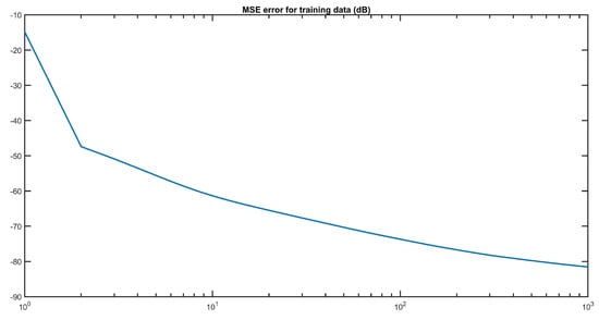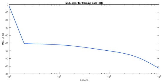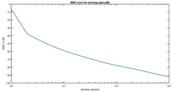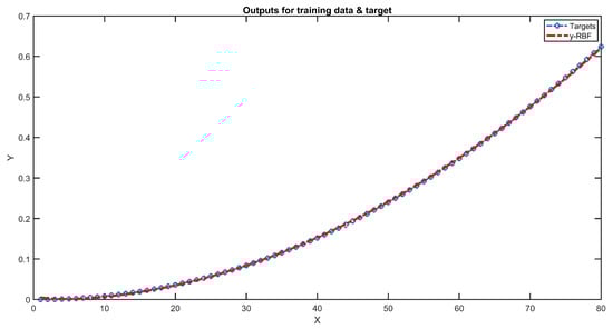 The learning rates were taken to be and . The parameters and were set to and respectively. For training phase, a total of 101 and 1001 values of x were applied ranging from 0 to 1. Table 1 reports the numerical results of the proposed method. Figure 2 plots the mean squared error for . Figure 3 and Figure 4 show the approximated output of present method compared to the actual output for the training and testing data.