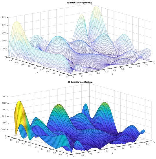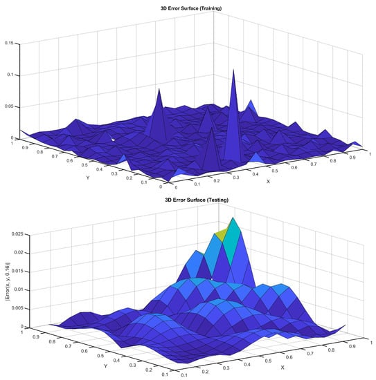 Table 2 lists the numerical results obtained of the proposed method. Figure 5 displays the mean squared error plot for training phase. Figure 6 represents The absolute error surfaces for test data points in and train data points in .