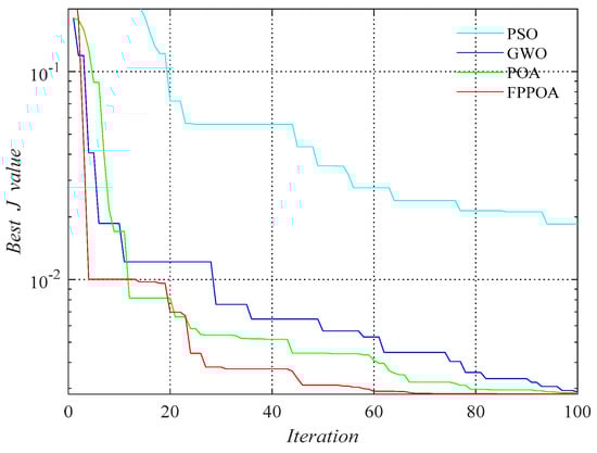 Figure 6 clearly shows that the FPPOA exhibits the swiftest speed of convergence and the tiniest J value. While reaching the optimal value, the POA exhibits a considerably slower convergence rate compared to the FPPOA. This indicates that, out of the four algorithms, the FPPOA delivers the most exceptional performance. From Figure 7, it is evident that the FPPOA always converges to the optimal value the fastest among the four algorithms. Additionally, according to Table 3, the parameter values derived from the FPPOA exhibit the closest proximity to the real value. These findings collectively showcase the superior convergence and stability of the FPPOA when compared to the remaining three algorithms.