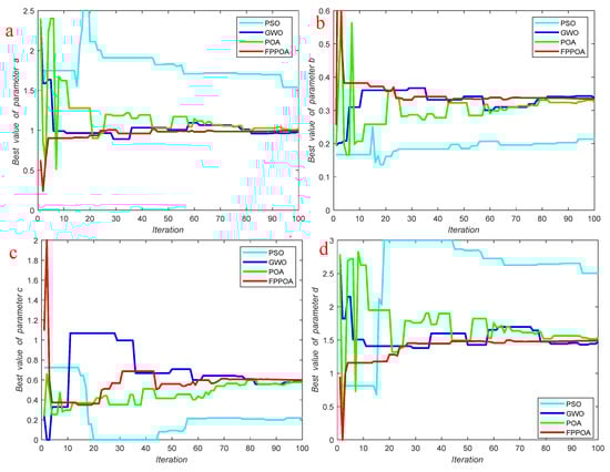 Convergence and optimization curve of parameters. (a) Optimization curve of parameter a. (b) Optimization curve of parameter b. (c) Optimization curve of parameter c. (d) Optimization curve of parameter d.