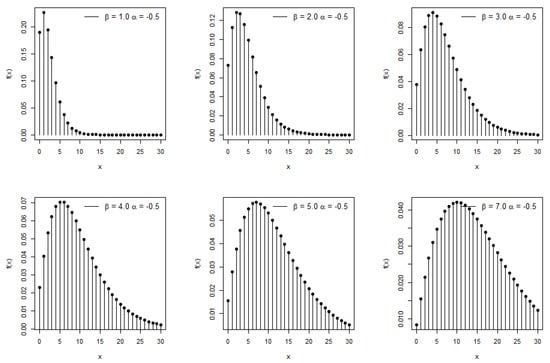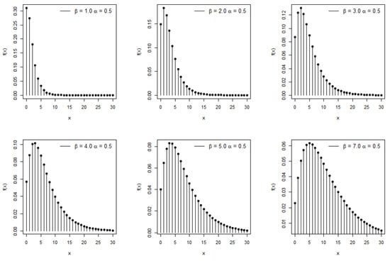 Plots of the pmf for the PTMEx distribution for different parameter selections are displayed in Figure 1, which may be found below. The behavior of the pmf demonstrates that the probabilities can take on a declining form and be unimodal. The parameter values determine the geometry of the pmf, which may or may not be symmetrical.