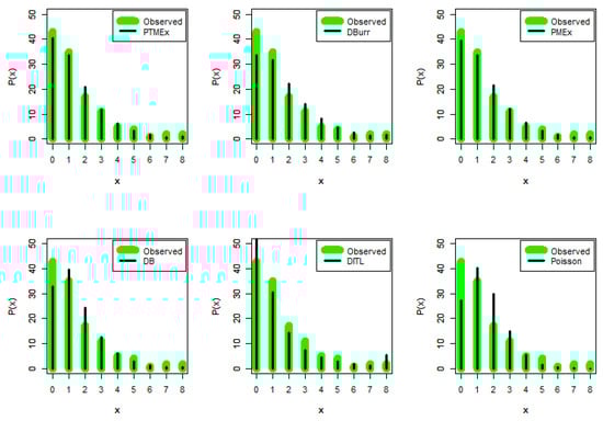 The first dataset, with 120 observations, is associated with a biological experiment on a European corn borer [25], and the observations are presented in Table 3. The experiment was performed randomly on 8 hills in 15 replications, and the examiner counted the number of borers per hill of corn. The estimates, along with the comparison measures of the PTMEx distribution and the other competitive distributions, are listed in Table 3. The estimated pmfs of the fitted models over the observed data are presented in Figure 2. From Table 3 and Figure 2, we can infer that the PTMEx distribution yields a better fit compared to the other distributions.