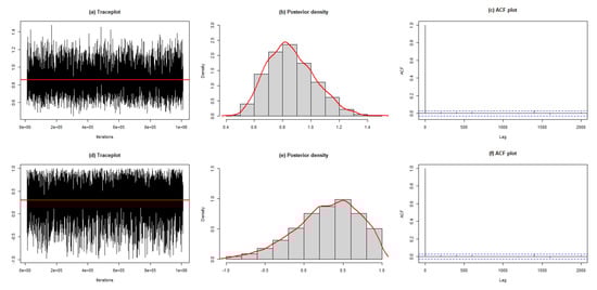 The next step is to estimate the parameters of the PTMEx distribution using the previously given corn borer dataset using the Bayesian approach. The distributions of the posterior samples for both parameters are illustrated in Figure 3. The trace plots depict the development of the MCMC drawings across iterations, suggesting that the produced samples converge well. The autocorrelation function (ACF) plots reveal that the posterior samples are uncorrelated. The corresponding Geweke z-scores for and are 0.2148 and 0.4915, also suggesting the satisfactory convergence of the samples to a stable distribution. The posterior means for and are (95% HDI: 0.5457 to 1.1705) and (95% HDI: −0.4441 to 0.9997). We can note that the ML and Bayesian estimates are fairly close to each other.