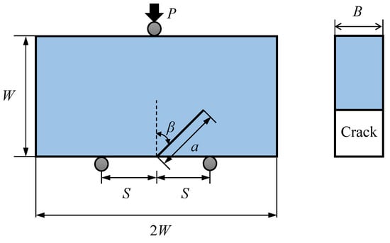 As shown in Figure 1, for the NDB specimen proposed by Luo et al. [23], the specimen width is W, the specimen length is 2W, the crack length is a, the angle between the pre-fabricated crack and the loading direction is β, the support span is 2S, and the specimen thickness is B.