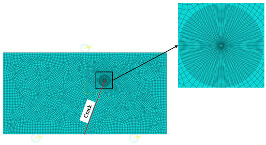 The J-integral approach was adopted to calculate KI and KII, and the integral interaction method was used to calculate T-stress [23,24,30]. Due to the singularity of stress distribution near the crack tip, singular cells were arranged in the first ring of the crack tip, and the size of the singular cells was less than 1/100 of the crack length a. In addition, a 20-turn four-node quadratic integral quadrilateral cell was divided around the singular cell using a sweeping technique. The distance between the edge of the outermost ring cell and the crack tip was about 1/9 of the crack length, and the rest of the region was divided freely to produce quadrilateral cells. The KI, KII, and T-stress at the crack tip of the specimen can be obtained by numerical computation. Then, YI, YII, and T* can be back-calculated according to Equations (2)–(4).