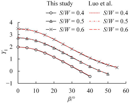 In order to verify the reasonableness of the model, the crack tip stress field of the NDB specimen at f = 0 and a/W = 0.4 was calculated and compared with the results of Luo et al. [23], as shown in Figure 3. With a different S/W and different β, the YI obtained through numerical simulation is basically consistent with the YI patterns and magnitudes obtained from the literature [23], demonstrating the rationality of the proposed numerical model.