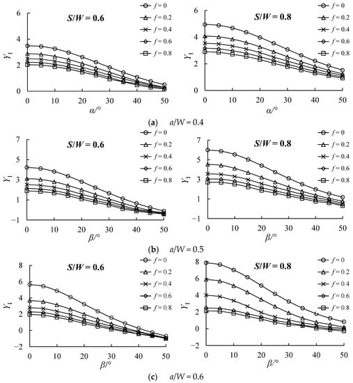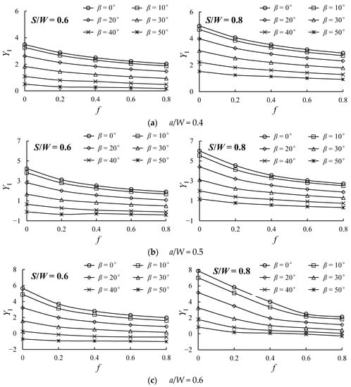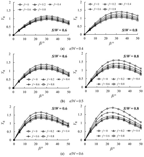 As shown in Figure 5, under any a/W, S/W, and f condition, as the crack inclination angle β increases, mode II load components start to appear, YII increases first and then decreases, and the YII–β relation curve is distributed in an asymmetric parabolic pattern.