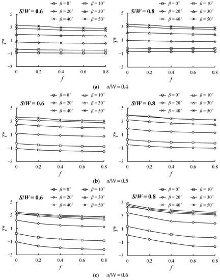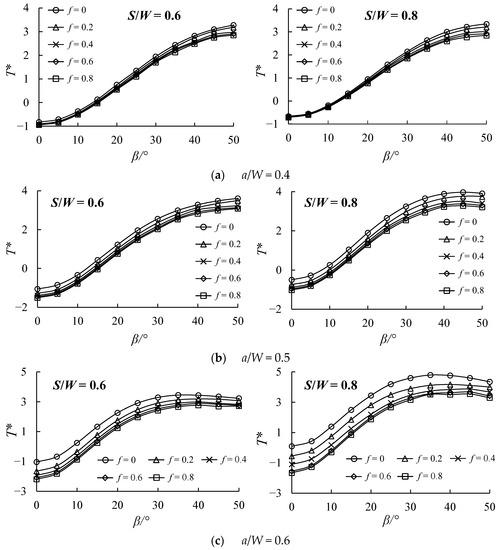 The T*–f relation curves for different a/W, S/W, and β conditions are shown in Figure 9. Overall, T* is not sensitive to f when a/W is small, regardless of the variation of β and S/W, and shows a horizontal trend. As a/W increases, the T*–f relation curve gradually shows a decreasing trend. For example, when a/W = 0.6, T* gradually decreases as f increases and tends to be stable after f reaches a certain value.