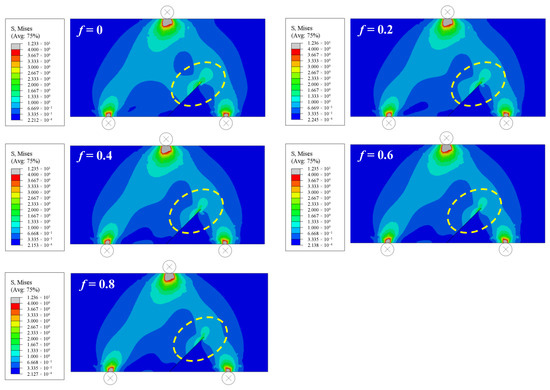 Mises stress nephogram of a typical NDB specimen (a/W = 0.5, S/W = 0.6, β = 45°) with different friction coefficients is shown in Figure 10. With the increase in the friction coefficient f, the range of Mises stress profile at the crack tip gradually decreases and basically stabilizes after f reaches 0.4, which confirms the trend of the normalized fracture parameter mentioned above that first decreases and then stabilizes with the increasing friction coefficient (Figure 7, Figure 8 and Figure 9). In addition, the elliptical zone (i.e., red- and orange-colored zones) near the bottom support tends to rotate inside the specimen due to friction force at the contact points.