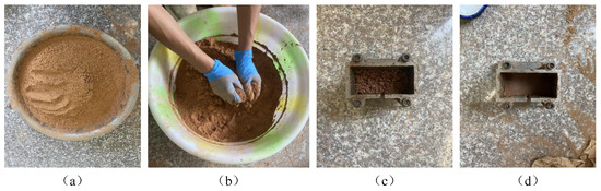 The specimen was prepared using a self-made compaction vessel with the dimensions of 100 × 50 × 80 mm. First, the dry density and moisture content of the compacted clay specimen were controlled to calculate the required mass of soil and water. In this test, a 95% degree of compaction was selected, the dry density of the compacted clay specimen was 1.6 g/cm3, and the optimum moisture content of 16.6% was taken. Then, the soil materials were mixed thoroughly, and the well-mixed soil materials were poured into a fresh-keeping bag in an airtight container to rest for 24 h. Second, the soil materials were poured into the compaction vessel, and rectangular specimens of 100 mm in length, 50 mm in width and 30 mm in thickness were obtained through layered compaction. Finally, the specimens were demolded, and then cutting equipment was used for crack preparation. The specimen preparation process is shown in Figure 11.